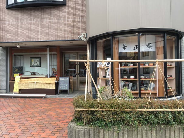 道路から見て右側の、建物の出窓には、グラデーションで表現した酒器や、華正工房アクセサリーを並べました。